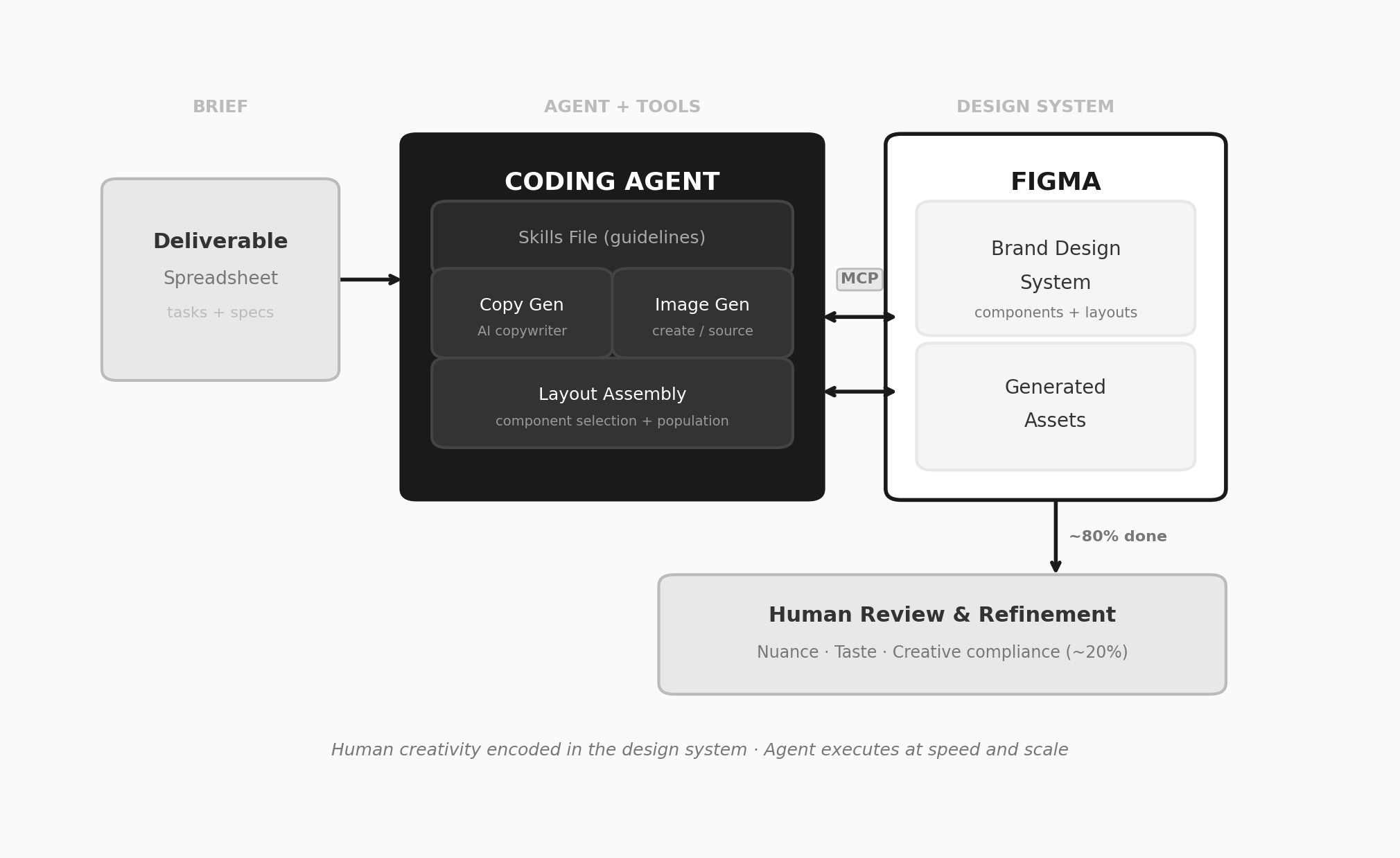We’ve been connecting a coding agent to Figma — through a custom plugin that bridges the two using Figma’s MCP capability and design editing APIs. The agent can read file structures, understand components, manipulate layers, swap content, and adjust layouts. It operates Figma much like a human designer would — just faster.