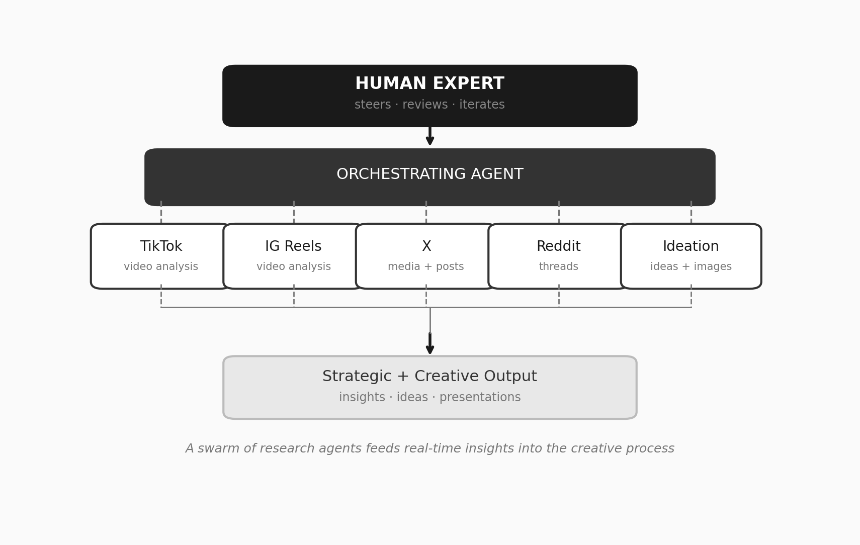 A swarm of research agents feeds real-time insights into the creative process.